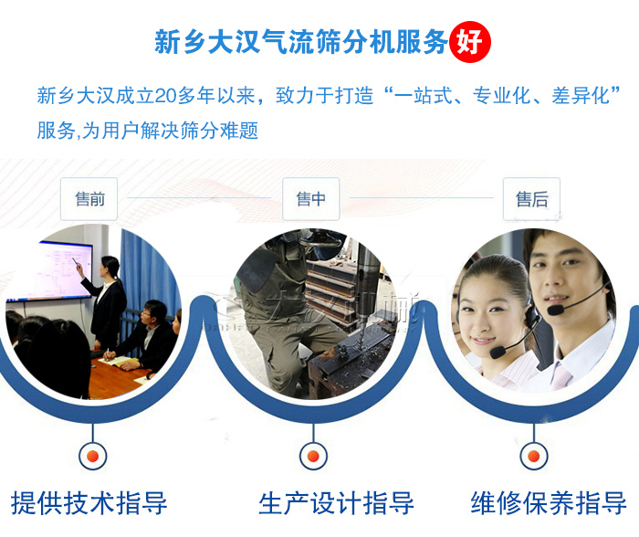 新鄉大漢成立20多年以來,致力于打造“一站式、專業化、差異化”服務,免費對用戶進行選型指導和安裝、調試及后期維修服務,不斷加強改善用戶的體驗,用戶購買我們的設備之后,我們會定期進行回訪調查,真實了解到每一位用戶的使用情況,以全面、細致的服務解決用戶所遇到的篩分難題。