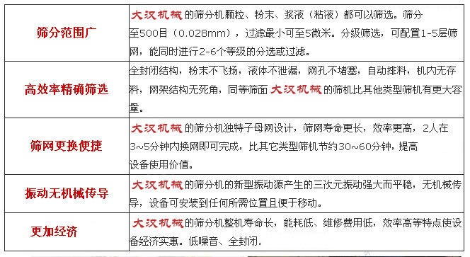大漢機械生產的不銹鋼篩分機可根據客戶不同需求,從篩面直徑400-2000mm,各種型號齊全,可滿足各種粉末、顆粒篩分需要求及液體過濾需求,也可設計為閘門式旋振篩、加緣式旋振篩等機型。使用范圍廣泛,0-500目的干、濕、精細、粗糙、大小比重粉末、顆??奢p松篩選,0-600目漿態物料可輕松過濾。我們針對不同用戶物料特性、處理量、篩分目標、場地限制、生產線配置等不同特點的需要,為每一位用戶量身打造適合自己使用的篩分機設備。
